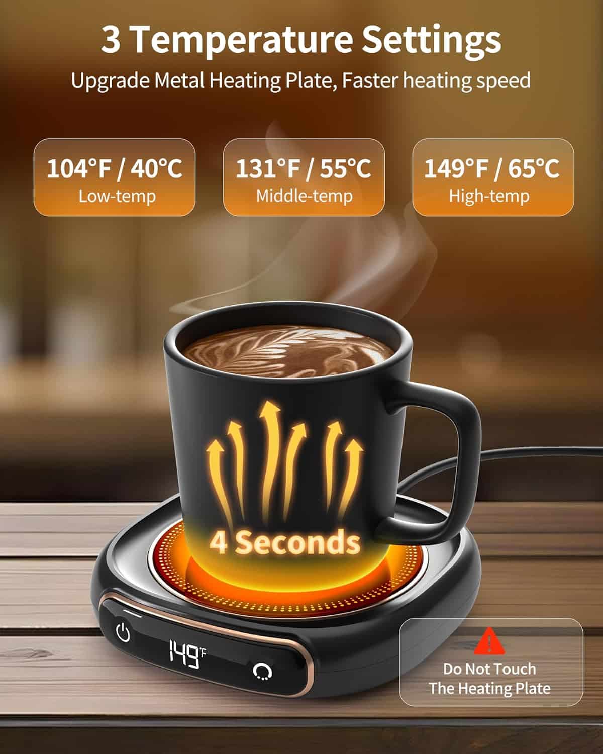 - 【CONSTANT 149°F Temperature】 Our Coffee Mug Warmer ensures that your beverages stay at a consistent 149°F, providing a perfectly warm sip every time. Whether you’re keeping your coffee hot or warming up a cold drink, this mug warmer maintains your desired temperature throughout. Tip: For even faster warming and better heat retention, use the lid to cover your cup.
