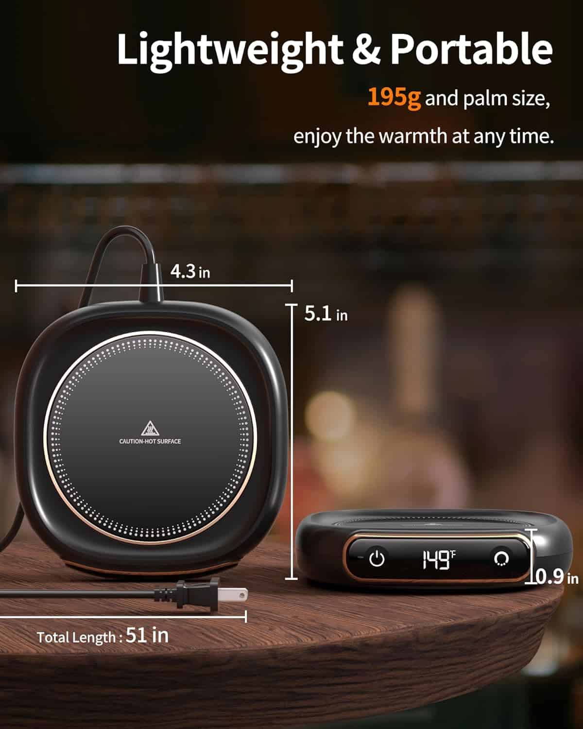 - 【PORTABLE and Easy to Clean】 Our coffee cup heater features a 1.3m (51-inch) power cord, weighs just 7 ounces, and is only 0.9 inches thick, making it easy to use anywhere. Constructed from durable ABS and aluminum alloy with an upgraded metal heating plate, it heats up quickly and is easy to clean. Additionally, it operates quietly, ensuring a peaceful environment.